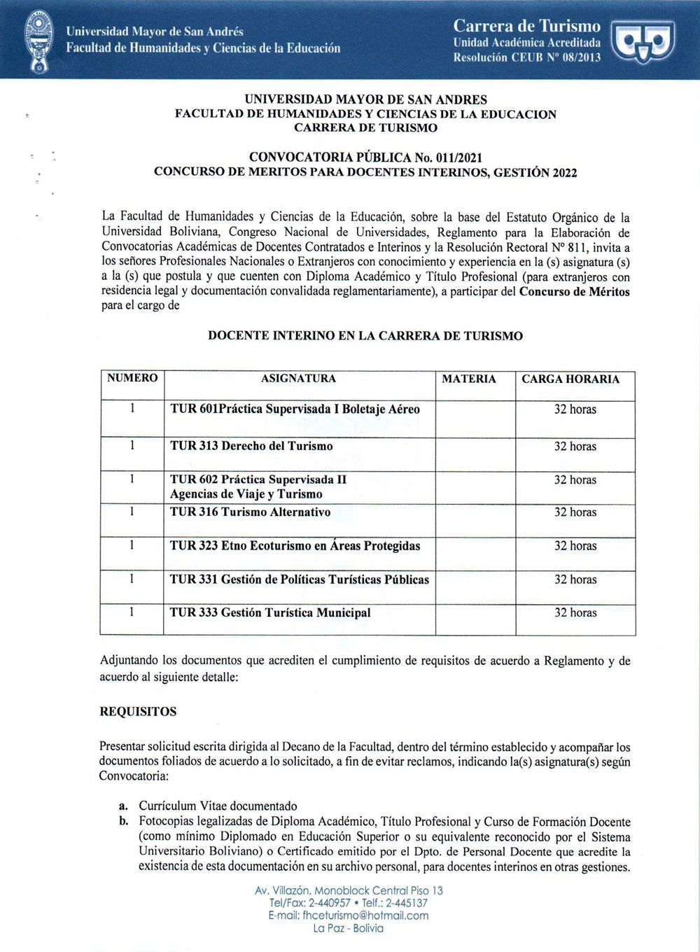 CONVOCATORIA PÚBLICA No. 011/2021 CONCURSO DE MERITOS PARA DOCENTES INTERINOS, GESTIÓN 2022 - CARRERA DE TURISMO